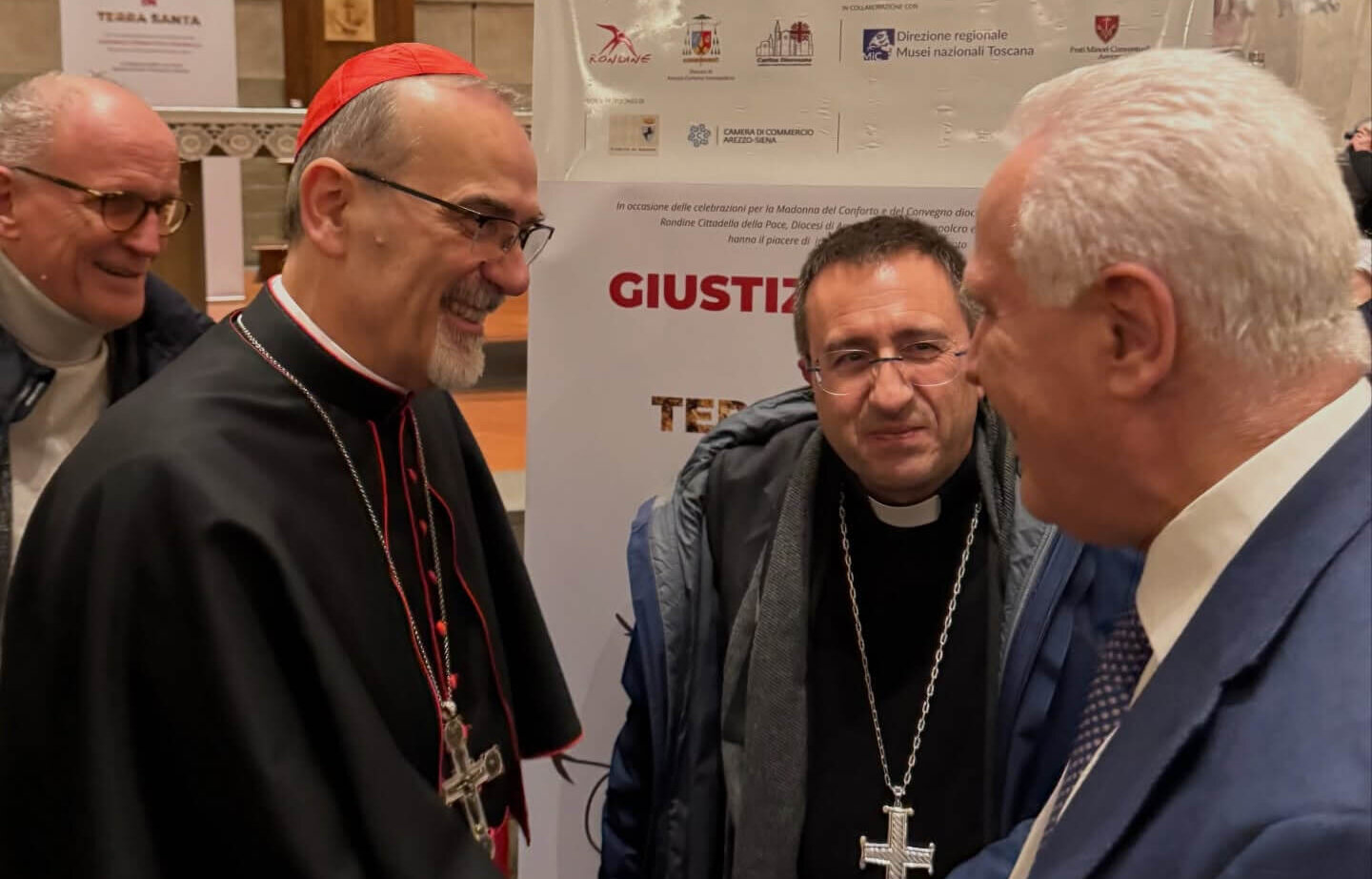 Poi nel pomeriggio di San Valentino l’incontro pubblico ‘Giustizia e Pace in Terra Santa’ ad Arezzo nella Basilica di San Francesco gremita con la lectio magistralis del cardinale Pizzaballa ‘Come ricostruire nuove relazioni di fiducia in Terra Santa’.