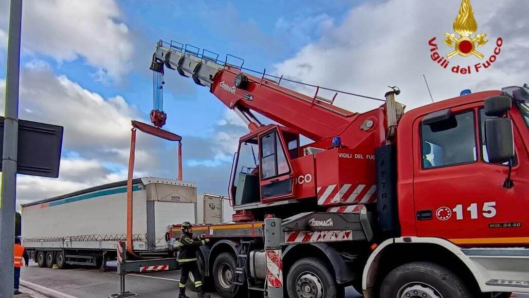 La rimozione ha richiesto l’utilizzo di mezzi speciali. I pompieri hanno dovuto impiegare un’autogrù per sollevare il rimorchio e riagganciarlo in sicurezza a un trattore stradale. L’operazione ha permesso di liberare la strada e ripristinare il traffico veicolare.