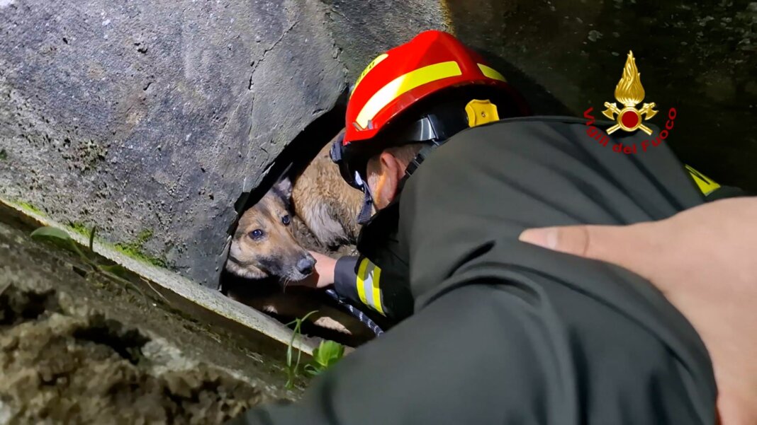 I vigili del fuoco hanno scavato e rimosso la terra dall’apertura, per proseguire con la rimozione della terra accumulata con le ultime piogge all’interno della tubatura in cemento restringendo ulteriormente lo spazio. Difficili e molto lunghe le operazioni per rimuovere la terra a mano dato gli spazi molto ristretti. Un vigile del fuoco, il più longilineo della squadra, è entrato all’interno del portavia, avanzando lentamente, rimuovendo terra e detriti, fino a raggiungere il cane che si è fatto prendere tranquillamente.