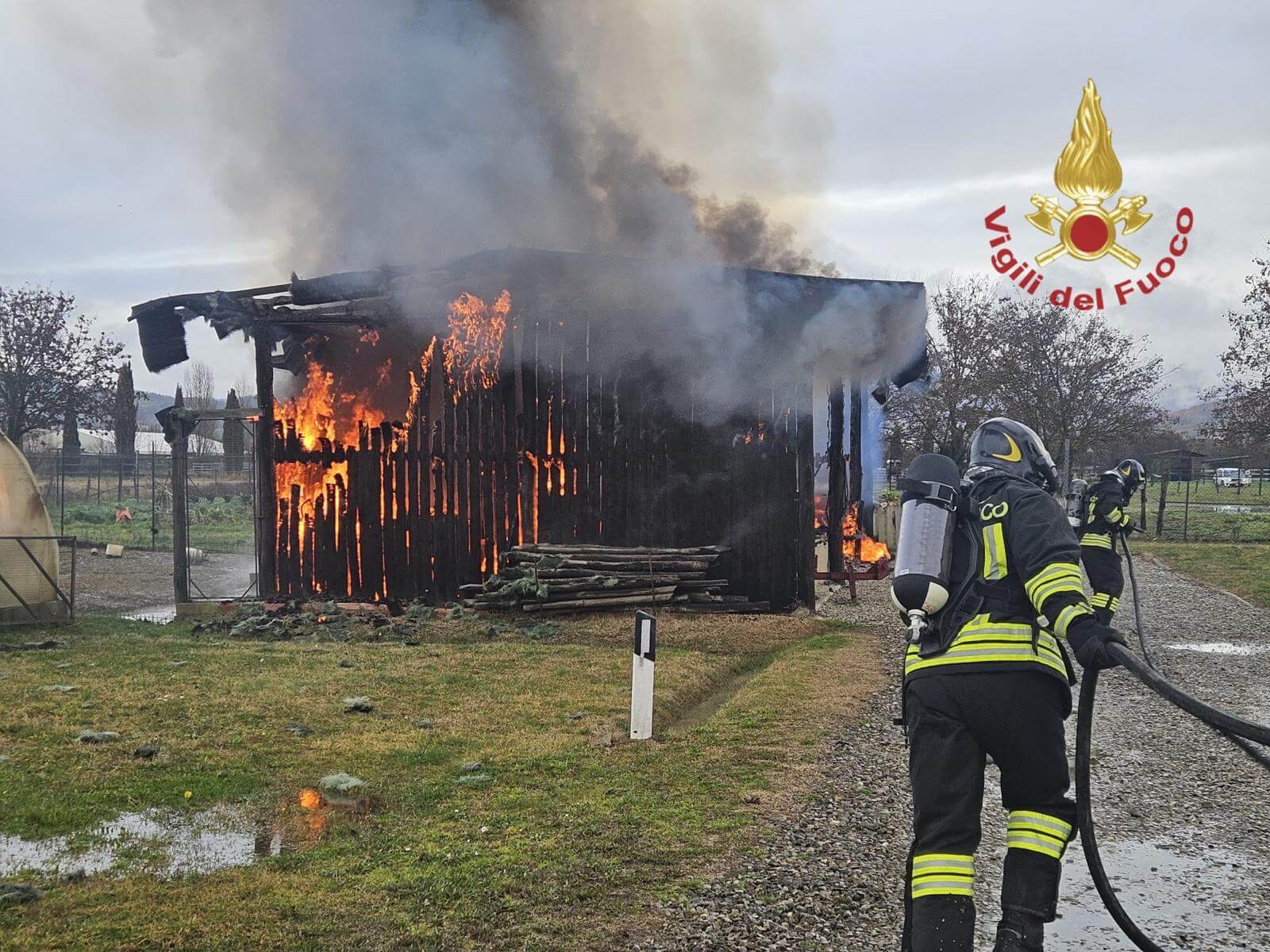 All’arrivo sul posto i vigili del fuoco hanno provveduto allo spegnimento dell’incendio, a causa del quale sono andati distrutti un trattore, un rimorchio adibito al trasporto di cavalli e vari attrezzi agricoli. All’interno si trovava anche una bombola di gpl che è stata portata all’esterno.