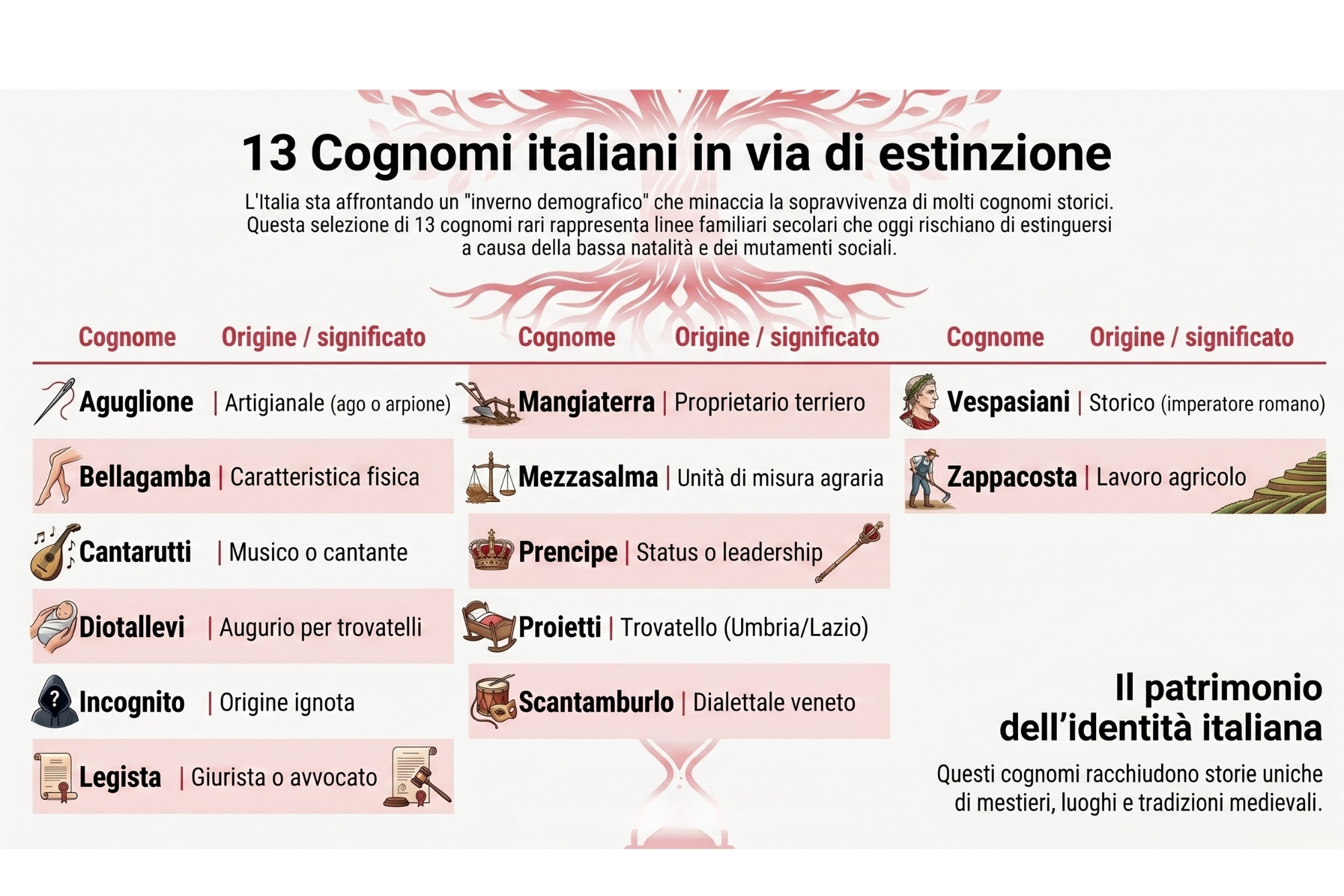 Aguglione, Cantarutti, Diotallevi. Secondo una ricerca di MyHeritage, piattaforma globale dedicata alla genealogia, questi sono tra i 13 cognomi italiani che rischiano di scomparire a causa delle culle sempre più vuote e delle profonde mutazioni sociali.