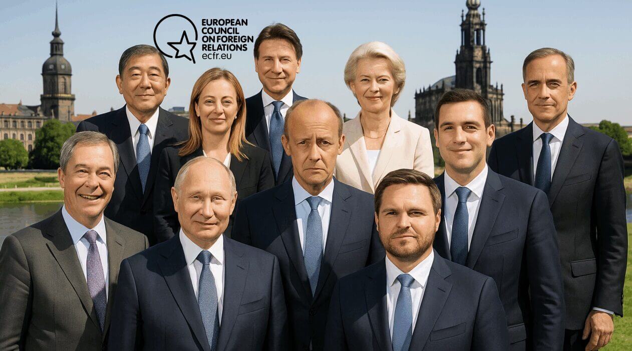 Per dare corpo a queste trasformazioni, Ecfr costruisce cinque scenari ambientati nell’agosto del 2029, in occasione di un G8 organizzato a Dresda. Tutto ruota attorno alla foto ufficiale: al centro c’è Putin, tornato al tavolo dei grandi su pressione del presidente americano J.D. Vance, erede diretto di Donald Trump. Accanto a lui siedono i nuovi leader dell’Europa: Bardella, Meloni, Merz (a capo di un governo di minoranza con l’appoggio di Afd), Farage. Gli ultimi rappresentanti del centro liberal – il canadese Mark Carney e il giapponese Ishiba – restano ai margini.