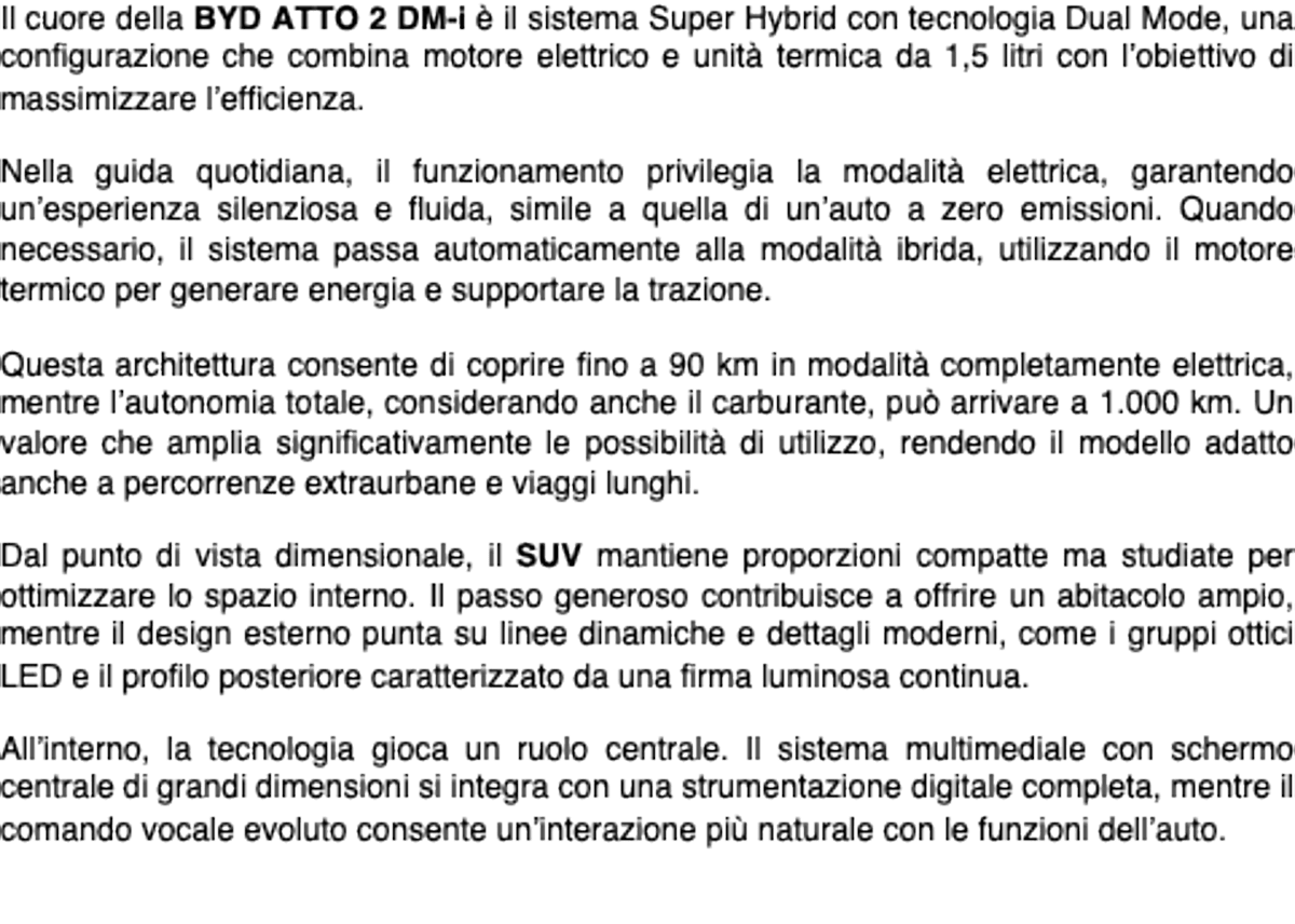 (Adnkronos) – Nel segmento dei SUV compatti, sempre più competitivo e orientato all’elettrificazione, arriva la nuova BYD ATTO 2 DM-i, un modello che introduce una soluzione ibrida evoluta pensata per coniugare efficienza, autonomia e praticità d’utilizzo quotidiano.