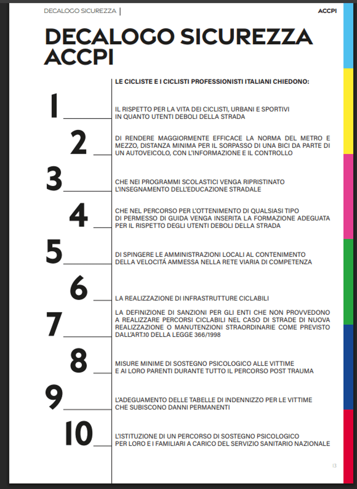 Non mancano altre ricette più per l’utenza normale, che si confronta con la predominanza di mezzi a motore sulle strade italiane: “la realizzazione di infrastrutture ciclabili; misure minime di sostegno psicologico alle vittime e ai loro parenti durante tutto il percorso post trauma; la definizione di sanzioni per gli enti che non provvedono a realizzare percorsi ciclabili nel caso di strade di nuova realizzazione o manutenzioni straordinarie come previsto dall’art.10 della legge 366/1998″. Infine, a danno ormai fatto, ” l’adeguamento delle tabelle di indennizzo per le vittime che subiscono danni permanenti” e “l’istituzione di un percorso di sostegno psicologico per loro e i familiari a carico del servizio sanitario nazionale”.