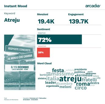 (Adnkronos) – Nelle ultime 24 ore la parola chiave Atreju, che raccoglie le conversazioni digitali sviluppatesi sull’appuntamento organizzato da Fratelli d’Italia al Circo Massimo a Roma, ha incassato in Rete oltre 139 mila interazioni. Questo volume, rivela l’analisi condotta da Arcadia, ha cristallizzato anche il modo in cui gli utenti si sono relazionati alla parola chiave della ricerca: il 72% ha manifestato un atteggiamento positivo, mentre il 28% si è espresso in modo negativo. In questo primo scorcio di analisi risultano interessanti anche i termini più utilizzati in riferimento ad Atreju: oltre a Meloni, ci sono scambi legati ai due principali leader delle opposizioni, Elly Schlein e Giuseppe Conte. —politicawebinfo@adnkronos.com (Web Info)