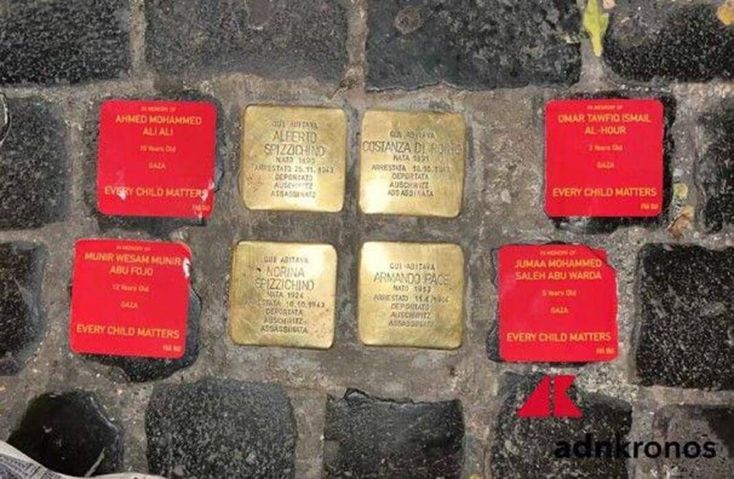 Adesivi a sfondo rosso con scritti nomi di vittime a Gaza, con tanto di età, sono apparsi a Roma accanto ad alcune delle pietre d’inciampo che ricordano gli ebrei morti nei campi di concentramento. In particolare, gli adesivi sono comparsi a Trastevere, in via Natale del Grande e a piazza san Cosimato – dove già sono stati rimossi -, oltre che a piazza Bologna. A rivendicare l’azione, con una nota inviata all’Adnkronos, il collettivo ‘Frà Tau’, che, come spiega, porta nel nome “il segno francescano del Tau”.