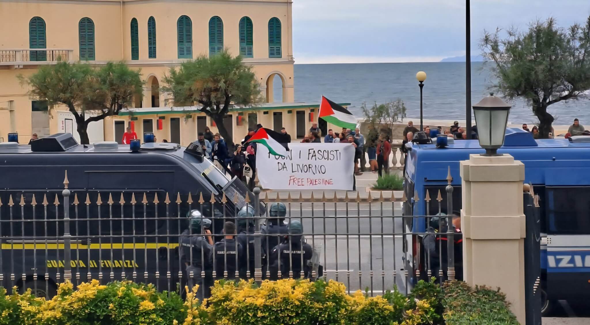 Bandiere della Palestina e striscione ‘Fuori i fascisti da Livorno. Free Palestine’