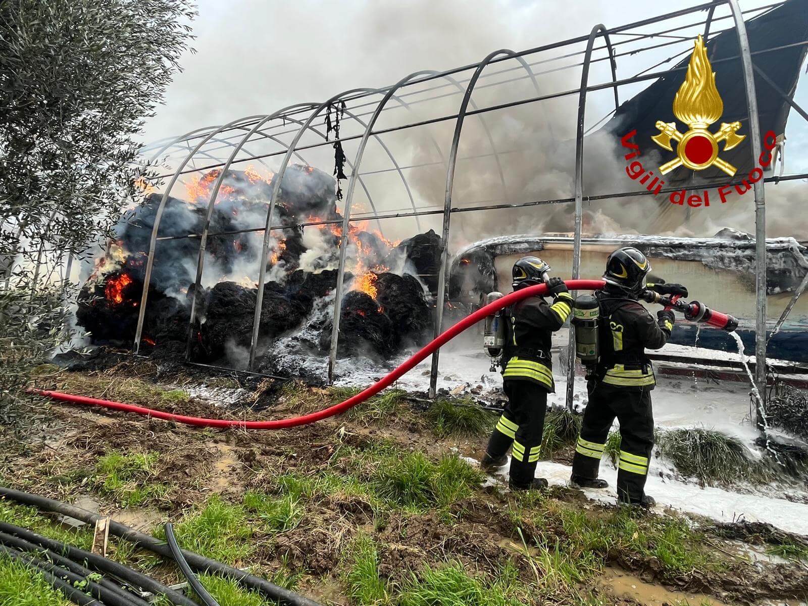 Il rogo ha causato la perdita totale dei beni custoditi all’interno del capannone. La forza delle fiamme ha incenerito un deposito composto da circa trenta rotoballe di fieno, distruggendo completamente anche due trattori e un’imbarcazione parcheggiati nel medesimo sito.