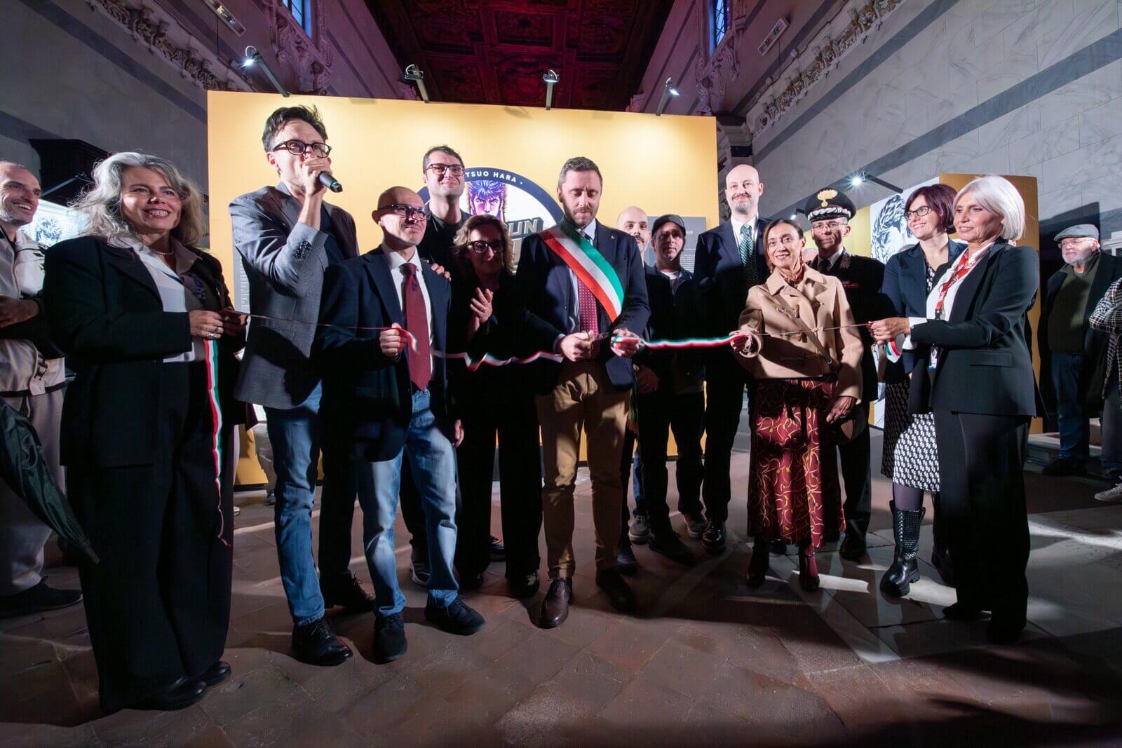 A tagliare il nastro il vicesindaco di Lucca Fabio Barsanti, la viceprefetto Stefania Trimarchi, l’amministratore Unico di Lucca Crea Nicola Lucchesi, il direttore di Lucca Comics & Games Emanuele Vietina, i curatori Alessandro Apreda e Guido Martini, con Enrico Croce di COAMIX Inc., insieme a Tommaso Galigani portavoce dei Musei degli Uffizi.