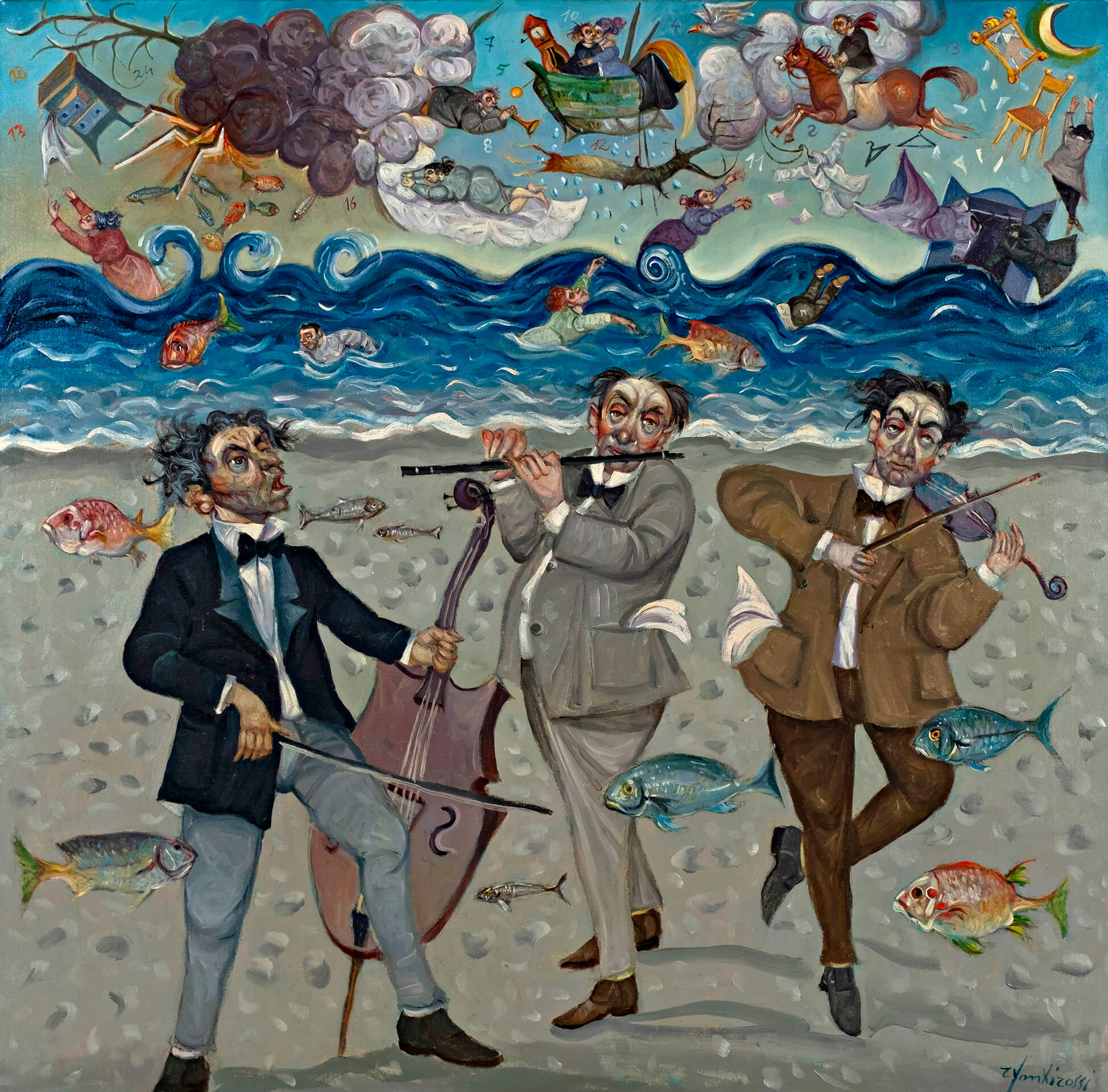 La mostra alla Gamc in Palazzo delle Muse in piazza Mazzini a Viareggio attraversa tutti i temi cari all’artista: dalla Cittadella, dove Fontirossi racchiude il sentimento per la sua città con quegli angeli che volano radenti, come nelle pitture medievali, sopra i lecci della Torre Guinigi, ai ‘Luoghi altrove’ come l’Anfiteatro, teatro dello spicciolo vivere quotidiano. C’è poi il mestiere di vivere, con quella varia umanità derelitta ma fiera, e il celebre Condominio di via dei Matti numero 103, dove vizi e virtù convivono in uno spaccato di casa di bambola tra segreti inconfessabili e banali rituali domestici.