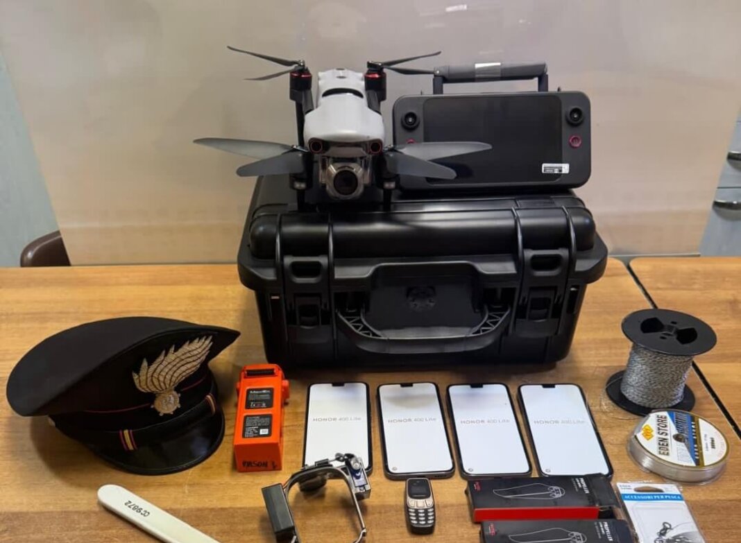 La successiva perquisizione veicolare ha confermato i sospetti degli operanti: l’uomo è stato trovato in possesso di un kit completo per il rifornimento illecito dall’alto. Nello specifico, sono stati rinvenuti e sottoposti a sequestro: undrone professionale dotato di radiocomando; un sistema di sgancio a distanza; quattro smartphone e un micro-telefono, pronti per la consegna; due bobine di filo da pesca, utilizzate per assicurare il carico durante le operazioni di volo.
